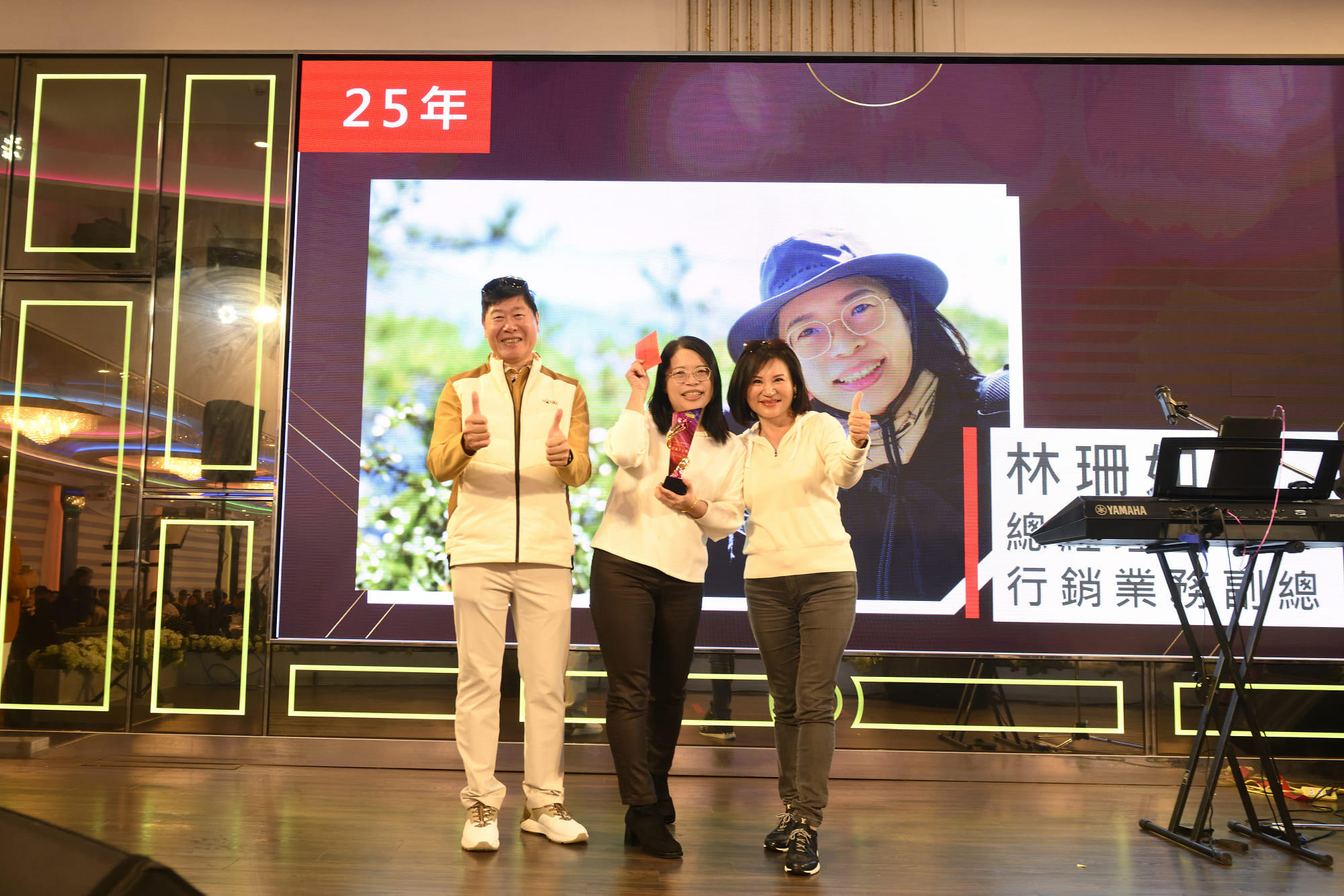 Un momento destacado de la velada fue el reconocimiento a 9 empleados que recibieron los Premios al Personal Sénior por sus 10, 20 y 25 años de dedicación. Cada galardonado recibió un trofeo conmemorativo y un premio como muestra de agradecimiento. La presidenta Tsai y el vicepresidente Lin expresaron su sincera gratitud, afirmando que en este día tan especial, no solo recordamos los esfuerzos y logros del año pasado, sino que también rendimos homenaje a la tenacidad y las contribuciones de estos empleados perseverantes. Todo esfuerzo, grande o pequeño, es algo que apreciamos profundamente.